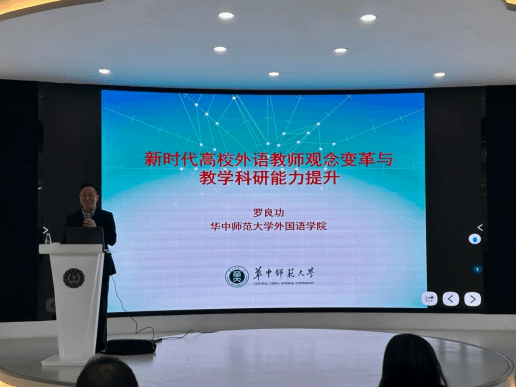 讲座过程中,罗良功教授深入浅出地讲解了新时代与中国高校外语教育、新时代高校外语教师的核心观念、新时代外语教师教学综合能力与教研科研能力提升等内容。他指出,新时代高校外语教育面临国际传播、人工智能、跨学科融合等多重机遇与挑战,高校外语教师必须锚定立德树人目标,树牢时代观念、发展观念、学科观念、育人观念、科研观念、合作观念,通过增强学科核心能力、国际传播与沟通能力、扎根中国的教学能力和新技术运用能力来提升教学综合能力,通过以教学促科研、构建个人学术体系、形成独立理论话语来提升教研科研能力。