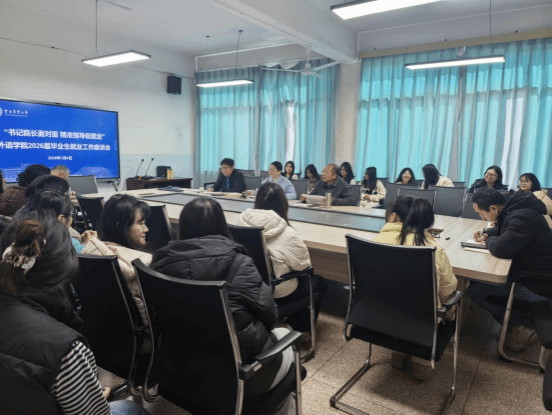 2026年1月4日,外语学院以“院长书记面对面,精准指导促就业”为主题召开2026届毕业生就业工作座谈会。院党委书记黎文、院长张吟松和2026届全体毕业生及其班主任、辅导员、帮扶教师参加座谈会,学院党委副书记冯军主持座谈会。