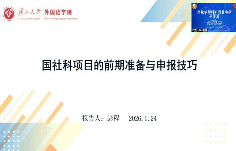 广西大学外国语学院彭程教授以《国社科项目的前期准备与申报技巧》为题,结合自身申报经验、近三年立项实例和国家社科年度项目申报书,详细讲解了国社科项目前期准备与申报技巧。
